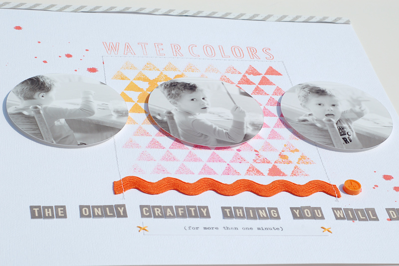 Here I used the template again, but with a different technique. I misted the template, then turned it over and placed it on the page (& repeated those steps a couple more times)—giving it a grungier look. The colors matched that transparency perfectly. I printed a couple playground photos from last summer and everything else just fell into place.
