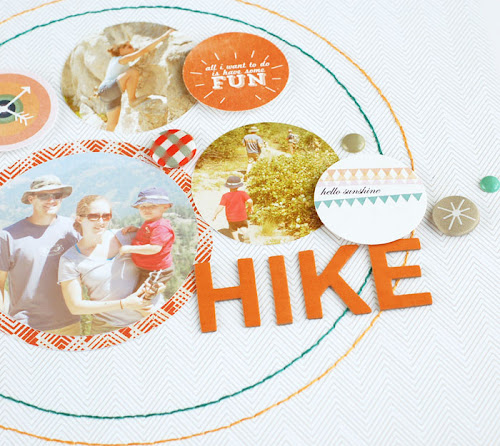 Today I'm sharing a new 12x12 layout. I used the Montage Circle Tags, Flair, and Little Labels for a layout with photos from our summer 2011 vacation to Idaho. I mimicked the target/arrow Montage circle by stitching large concentric circles on the page. I love how it pulls your eyes to the center of the page where all the action is.